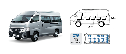 The Nissan NV350 Urvan Minibus is available in two passenger seating configurations, with the option of Wide Body High Roof, Wide Long Body with High Roof or Standard Body Standard Roof.
